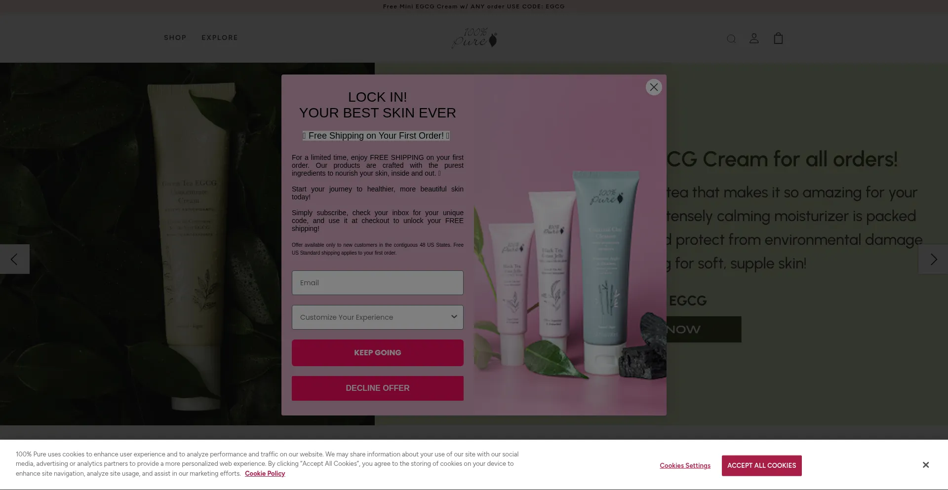 El sitio web implementa mecanismos de consentimiento de cookies en cumplimiento con regulaciones de privacidad como GDPR o CCPA. Esto demuestra que 100percentpure.com adhiere a estándares de protección de datos y proporciona a los usuarios control sobre prácticas de recolección de datos personales.