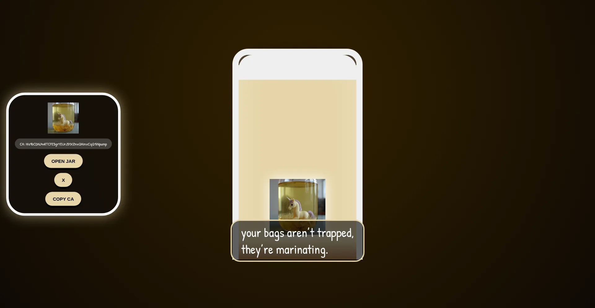 Unicorn Brine – tiny unicorn pickled in your liquidity. Your bags aren't trapped, they're marinating.