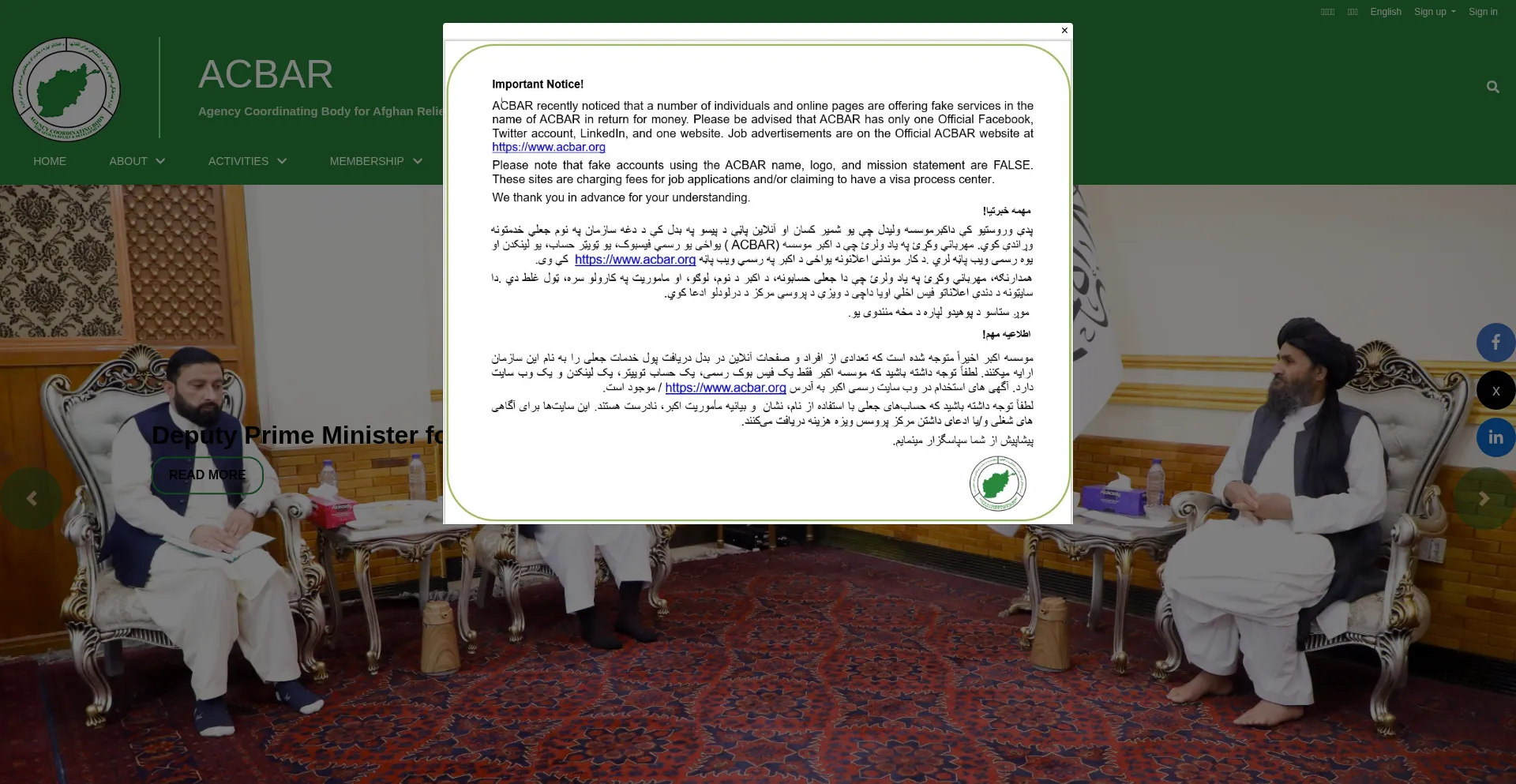 La presencia de enlaces de redes sociales en el sitio web indica que acbar.org mantiene cuentas oficiales en redes sociales, lo que es un indicador positivo de credibilidad y compromiso.
