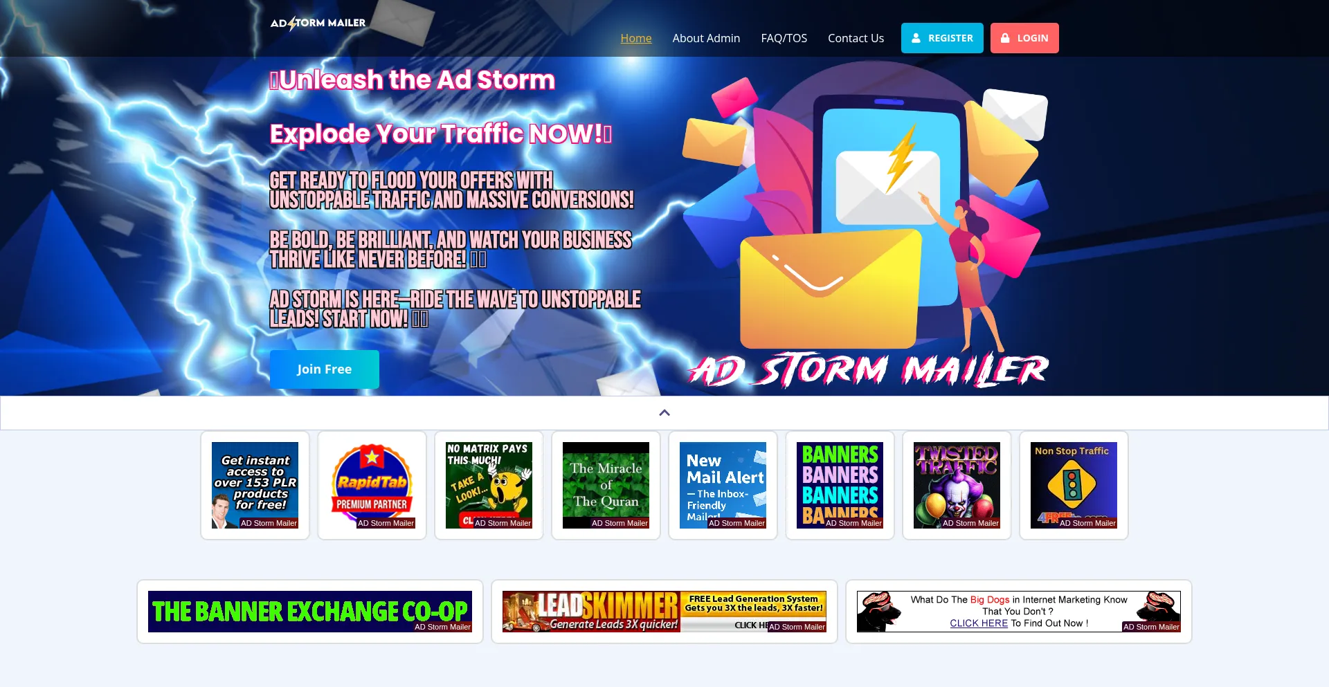Unleash the power of AD Storm Mailer! Instantly boost traffic, maximize conversions, and skyrocket your offers with our fast, easy-to-use email advertising system. Start now! "
