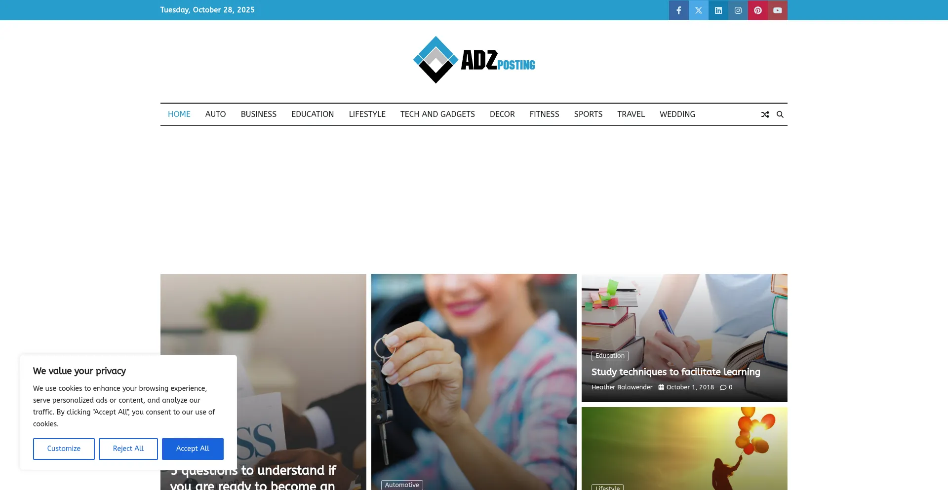 El sitio web implementa mecanismos de consentimiento de cookies en cumplimiento con regulaciones de privacidad como GDPR o CCPA. Esto demuestra que adzposting.com adhiere a estándares de protección de datos y proporciona a los usuarios control sobre prácticas de recolección de datos personales.