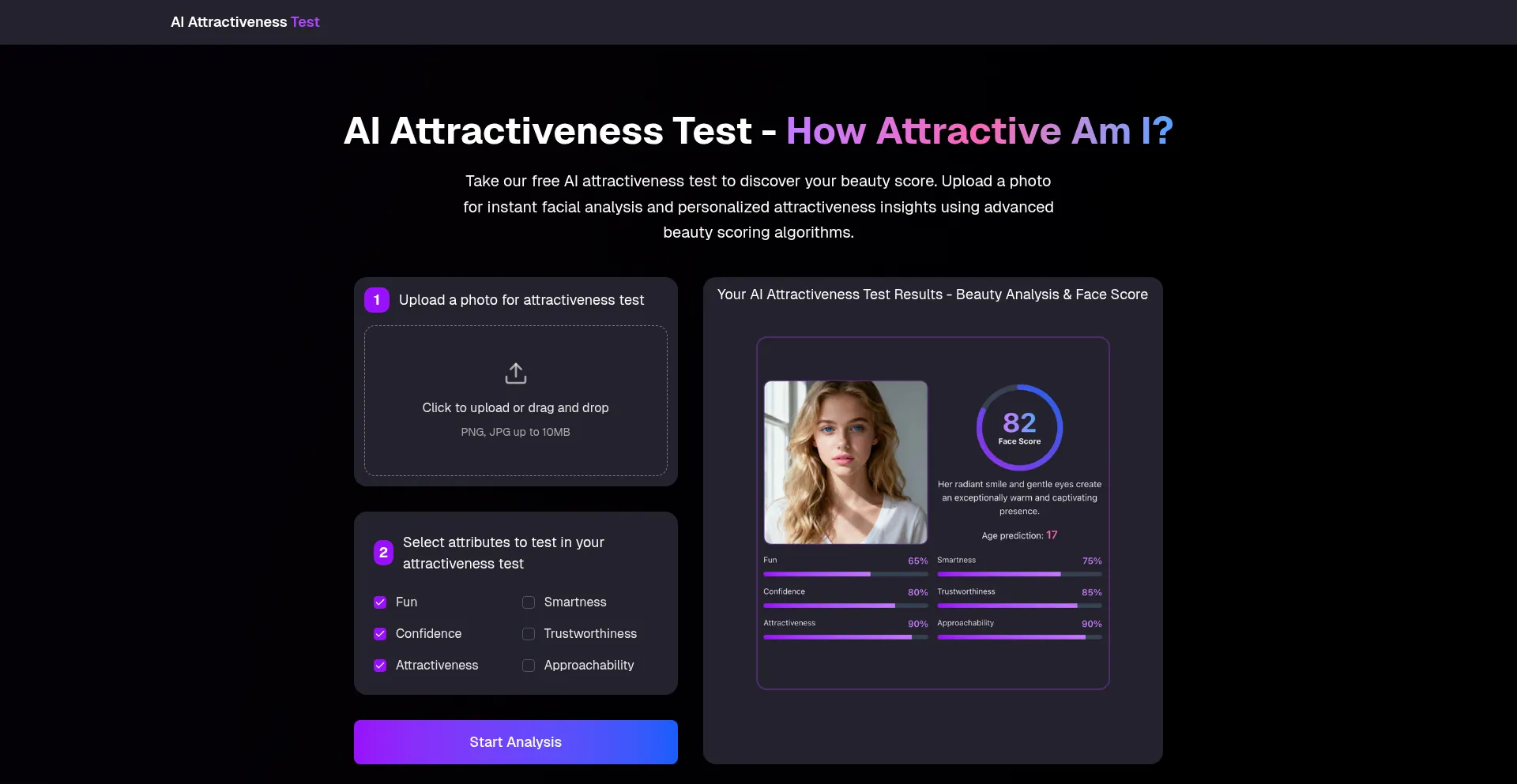 Take our free AI attractiveness test to discover how attractive you are. Get instant facial analysis, beauty scores, and personalized insights. No registration required. Try the...