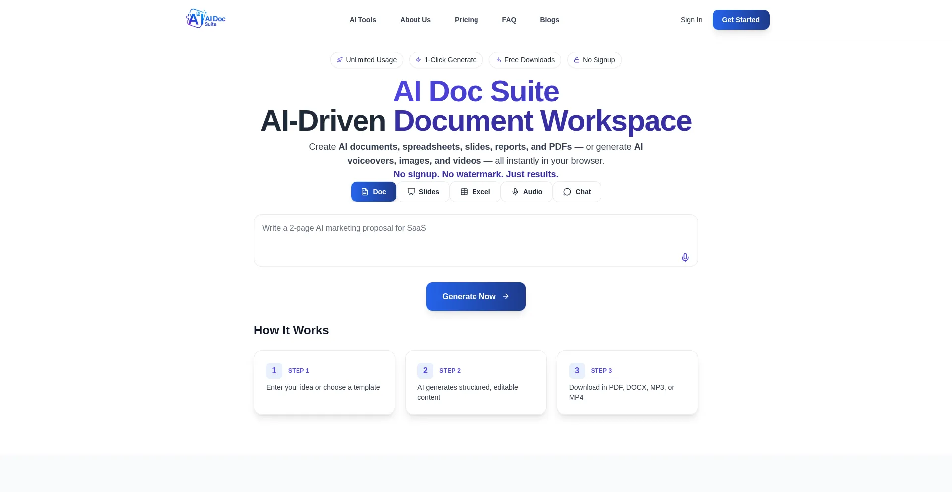 Create AI documents, sheets, slides, reports, PDFs, voiceovers, videos, and images — just click, and it builds with AI Doc Suite. Free, fast, and watermark-free.