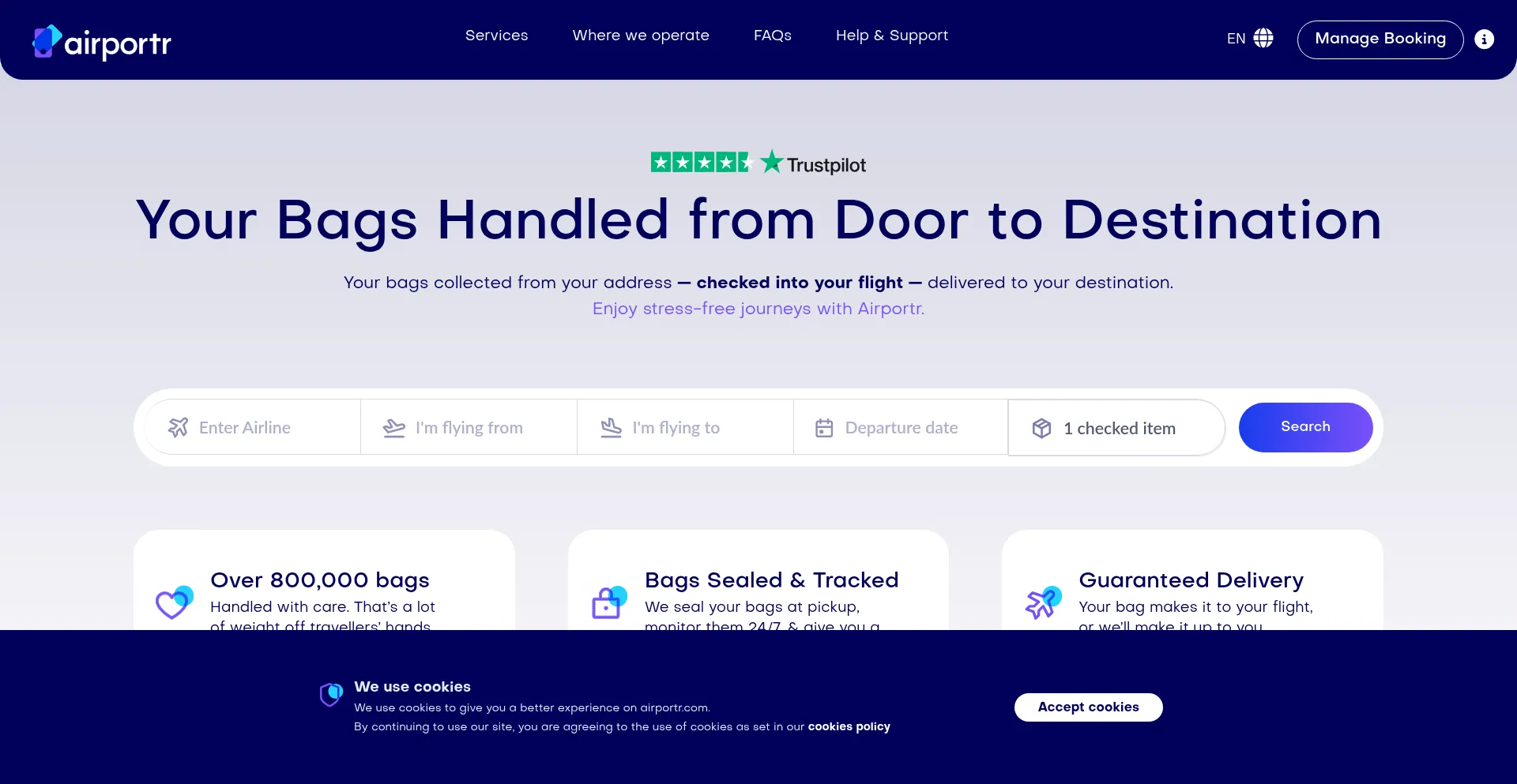 Travel hands-free with our trusted airport baggage services. Luggage collection, check-in and delivery. Ship bag drop queues. Book today.
