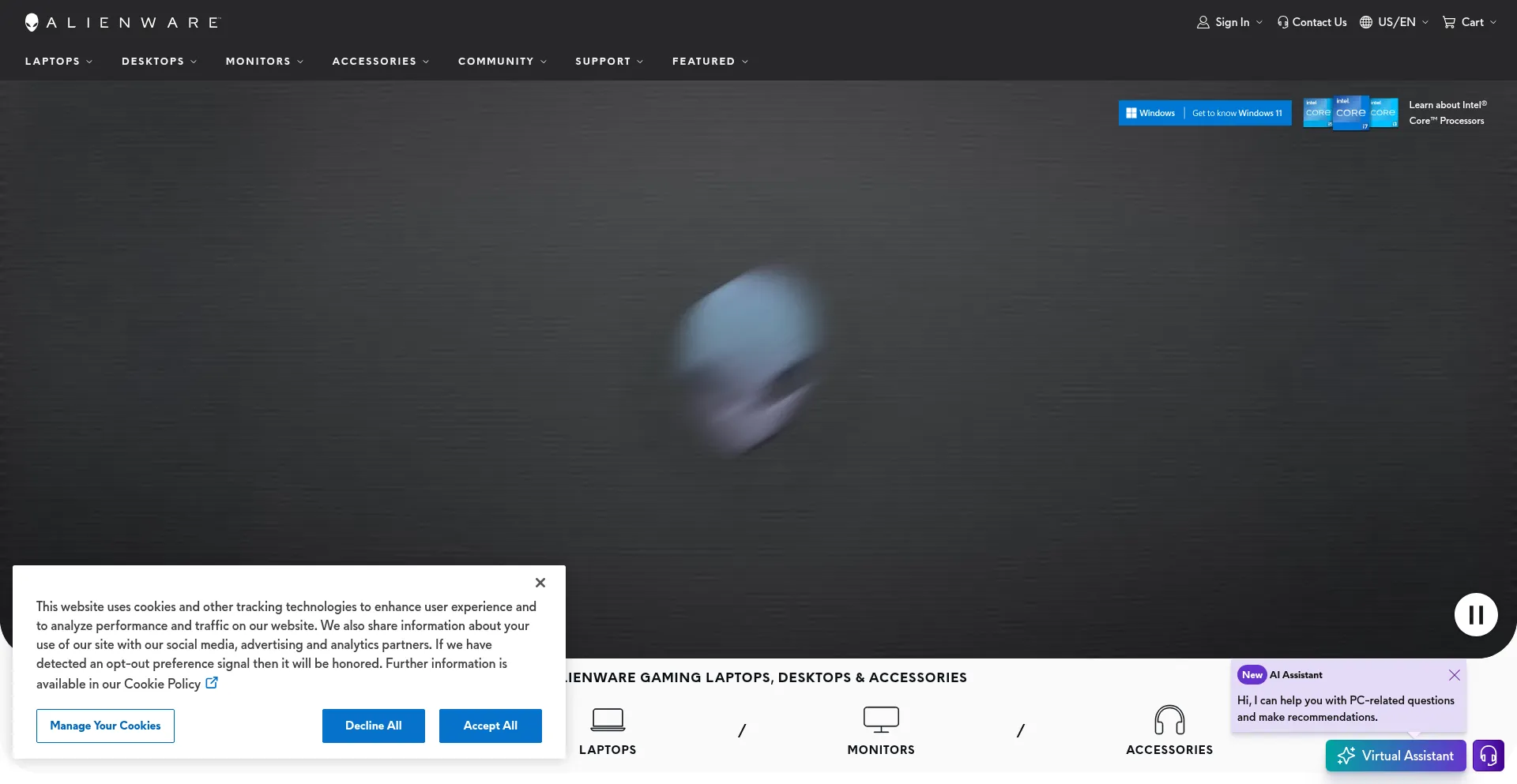 El sitio web implementa mecanismos de consentimiento de cookies en cumplimiento con regulaciones de privacidad como GDPR o CCPA. Esto demuestra que alienware.com adhiere a estándares de protección de datos y proporciona a los usuarios control sobre prácticas de recolección de datos personales.