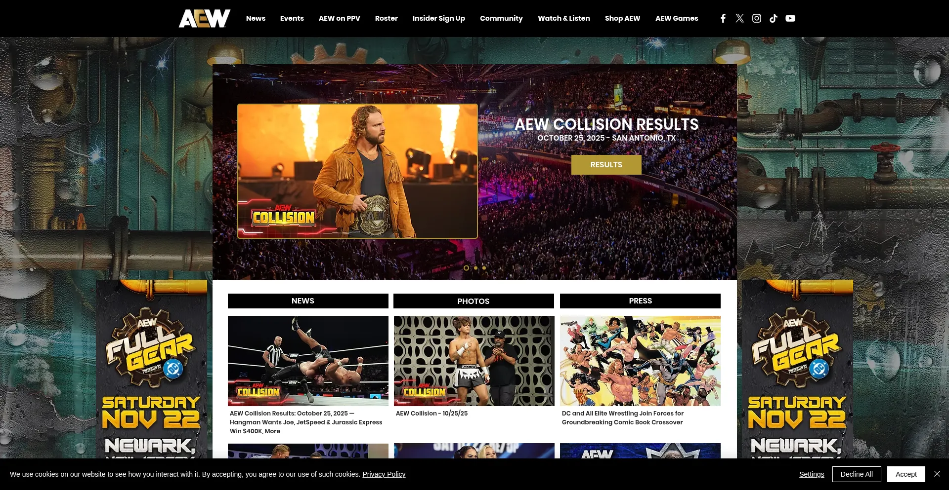 Visit the official website of All Elite Wrestling. Discover the latest news, videos, and events from AEW Dynamite and AEW Collision