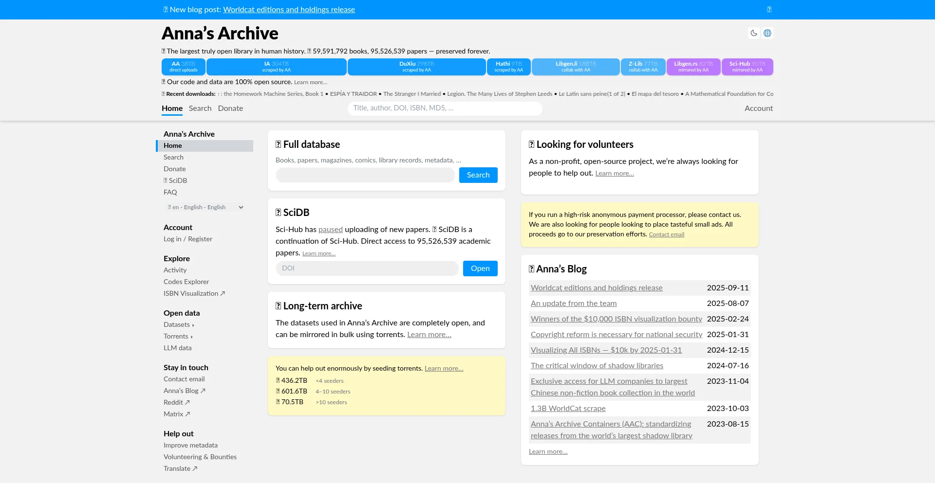The world’s largest open-source open-data library. Mirrors Sci-Hub, Library Genesis, Z-Library, and more.