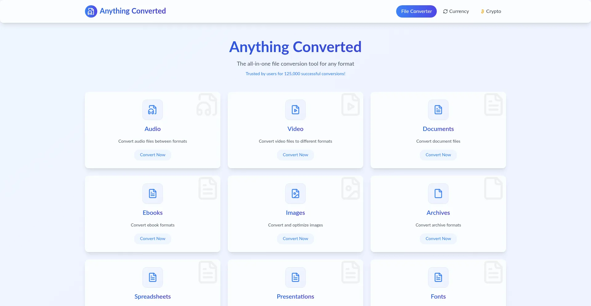 Convert any file format instantly with Anything Converted. Support for audio, video, documents, images, and more. Fast, secure, and 100% free online file conversion tool.
