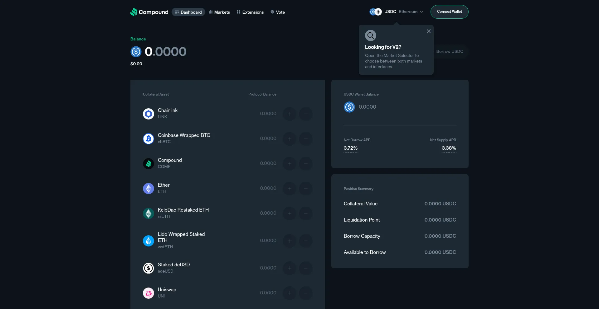 A full featured dashboard to interface with the Compound III protocol directly. Earn interest, borrow against your assets, and participate in community governance.