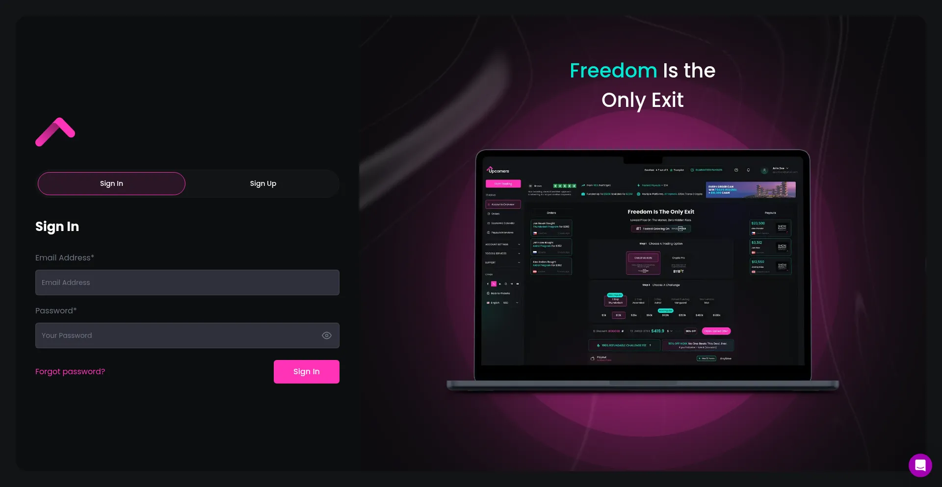 The fastest growing prop trading firm! Get a Simulated Forex Trading Account and trade up to $200,000 simulated forex trading account with Upcomers funding.