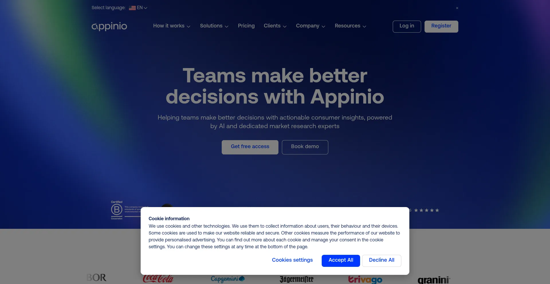 El sitio web implementa mecanismos de consentimiento de cookies en cumplimiento con regulaciones de privacidad como GDPR o CCPA. Esto demuestra que appinio.com adhiere a estándares de protección de datos y proporciona a los usuarios control sobre prácticas de recolección de datos personales.