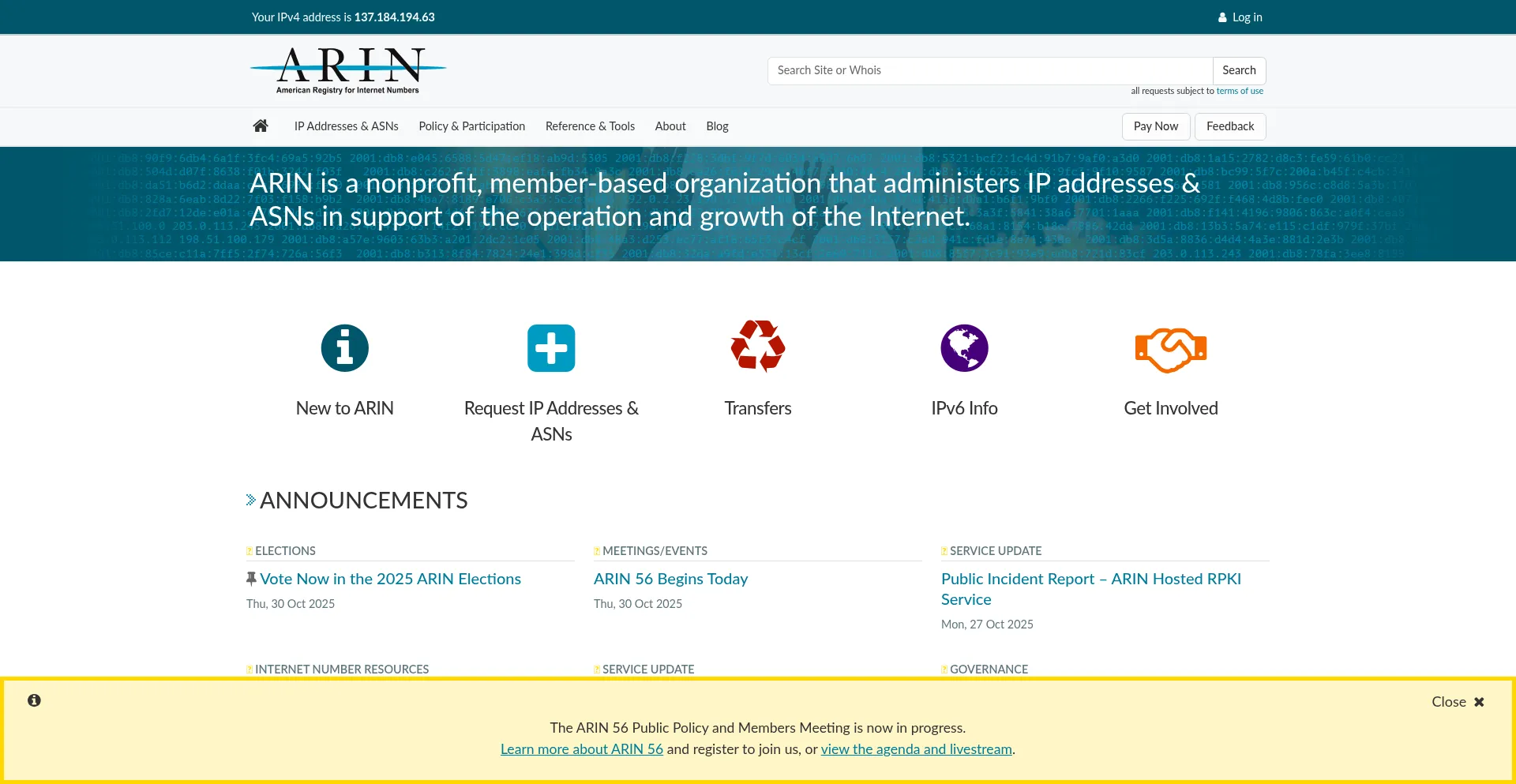 ARIN is a nonprofit, member-based organization that administers IP addresses & ASNs in support of the operation and growth of the Internet.