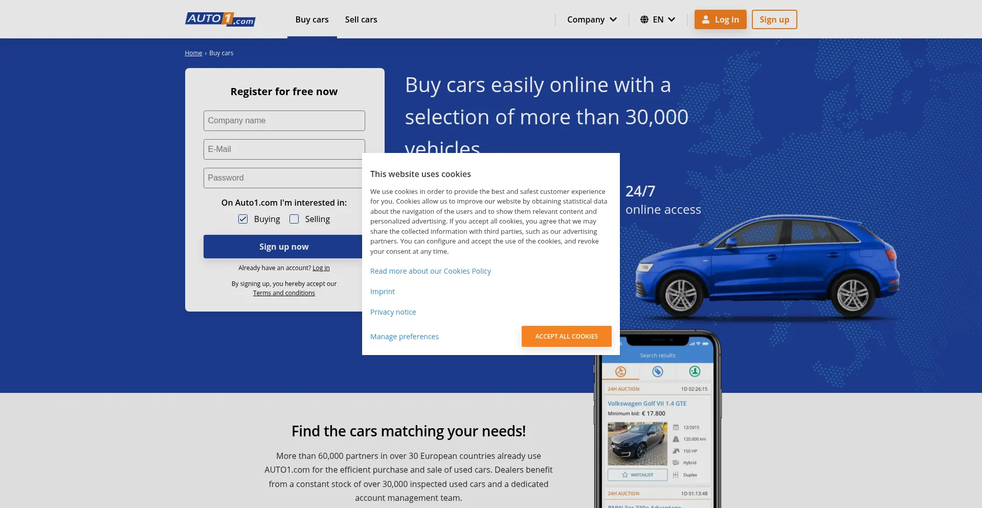 AUTO1.com enables you to buy cars easily online with a selection of more than 30,000 cars. Benefit from 3.000+ cars added daily and 24/7 online access.