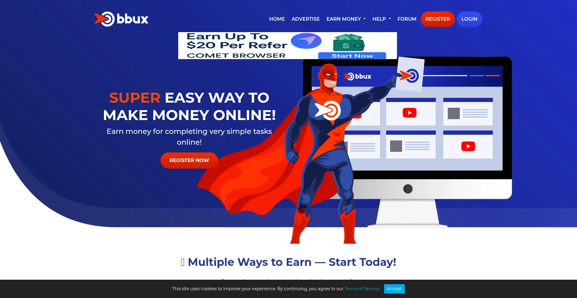 Earn cash by viewing ads and videos, completing surveys & offers, referring friends for commissions, and exchanging web traffic at BBUX.