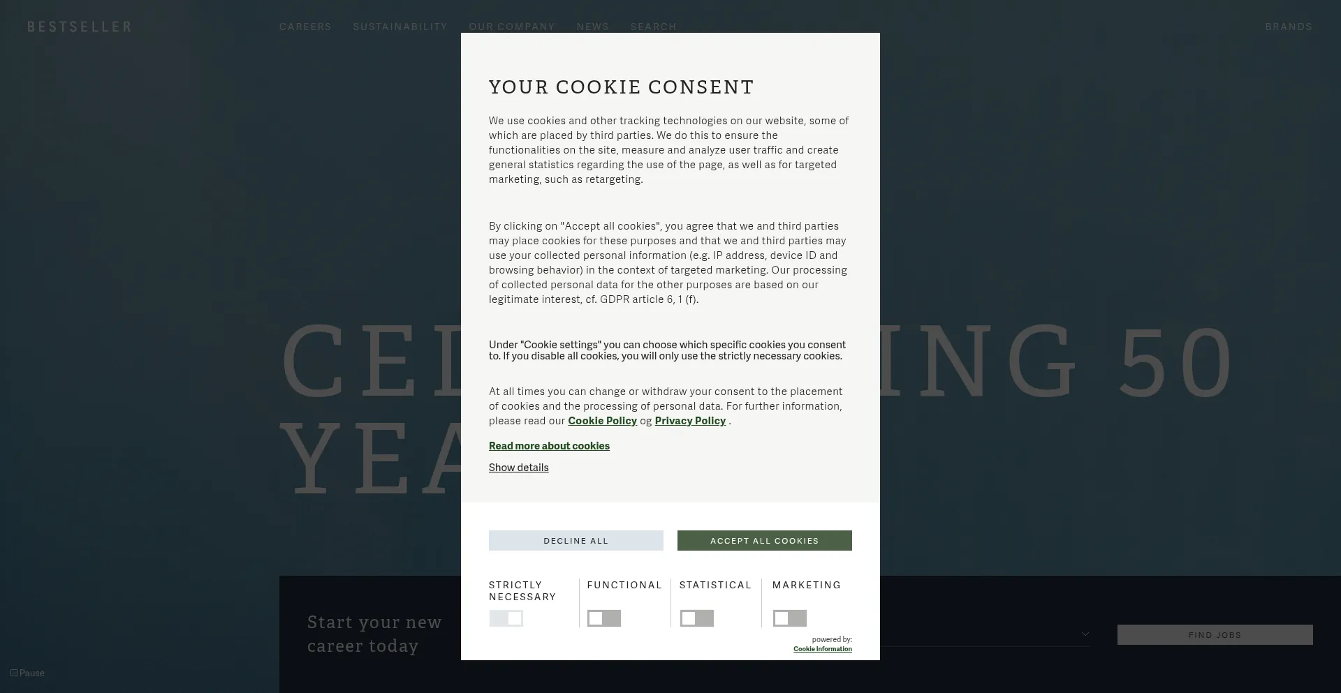 El sitio web implementa mecanismos de consentimiento de cookies en cumplimiento con regulaciones de privacidad como GDPR o CCPA. Esto demuestra que bestseller.com adhiere a estándares de protección de datos y proporciona a los usuarios control sobre prácticas de recolección de datos personales.