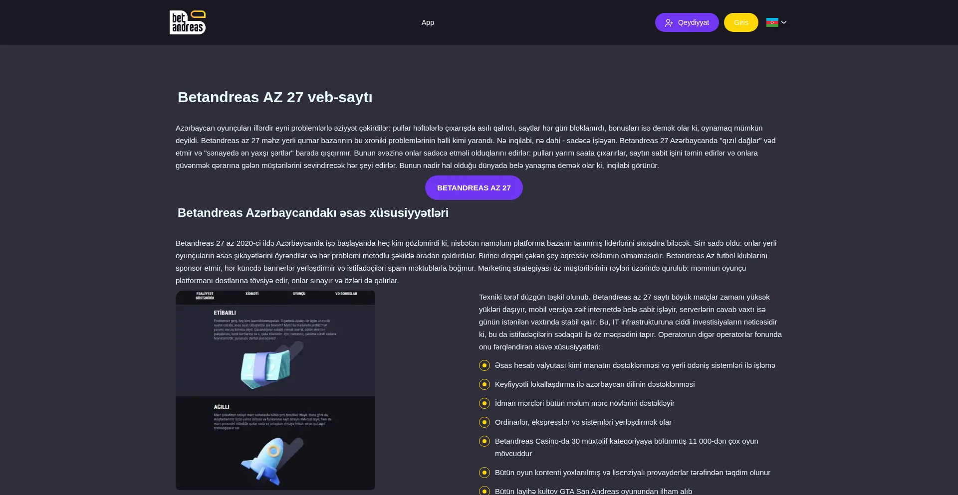 Betandreas AZ 27 portal vasitəsilə Azərbaycanlı oyunçular üçün müxtəlif bahis və kazino əyləncələri, ani pul köçürmələri və keyfiyyətli müştəri xidməti...