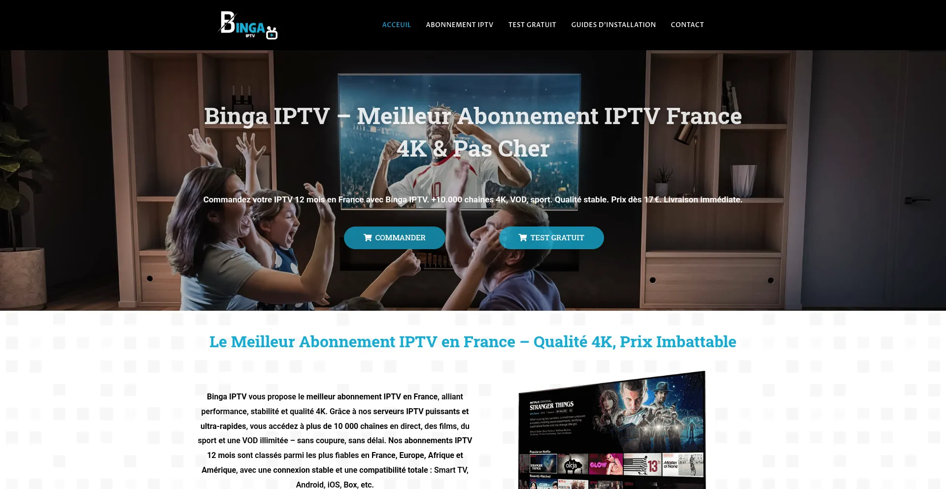Commandez votre IPTV 12 mois en France avec Binga IPTV. +10.000 chaînes 4K, VOD, sport. Qualité stable. Prix dès 17 €. Livraison immédiate.Meilleur abonnement iptv