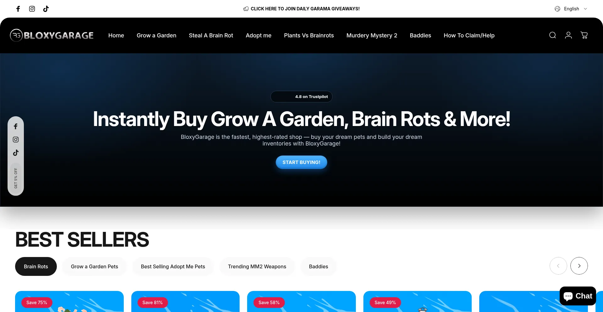Shop for the cheapest and best Roblox items today, from Adopt me, Grow a Garden, MM2, and even Steal a Brain Rot, at BloxyGarage we've got you covered!