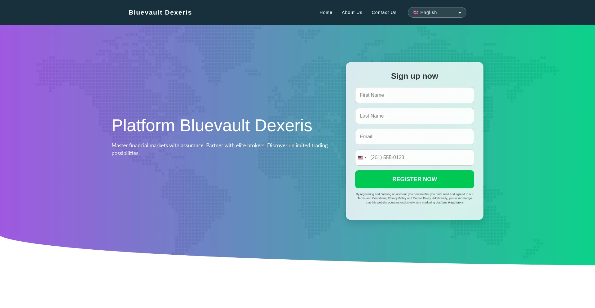 El sitio web implementa formularios de recolección de datos solicitando información personal incluyendo nombres, direcciones de correo electrónico, números de teléfono u otros detalles sensibles. Los usuarios deben verificar la legitimidad de bluevault-dexeris-app.com y revisar políticas de privacidad antes de enviar datos personales.
