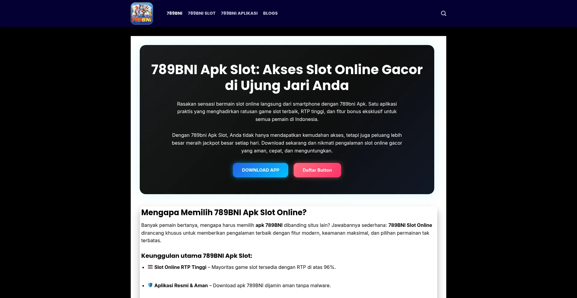 Mainkan slot online gacor lewat 789BNI Apk! Akses mudah, game terlengkap, dan jackpot besar siap menanti Anda setiap hari. Unduh sekarang!