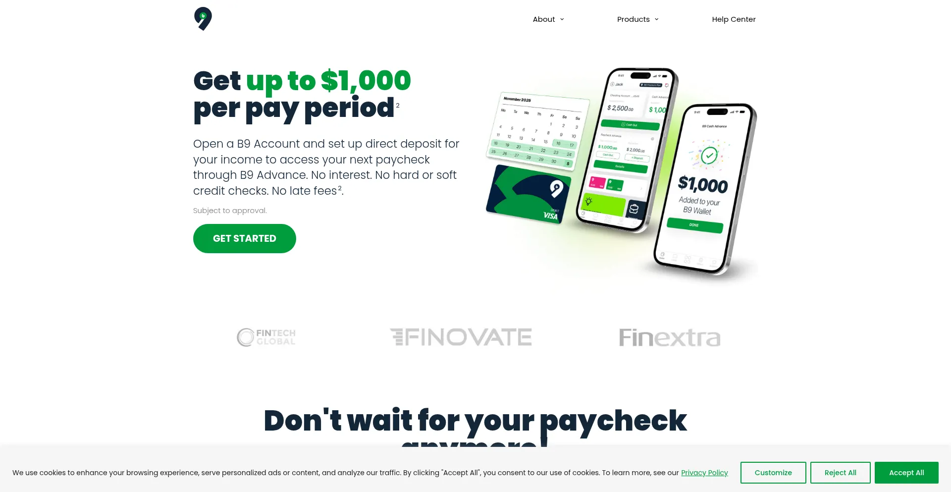 B9 is an app that gives you early access to up to $1,000 of your paycheck per pay period. B9 Visa® Debit Card With up to 5 % cashback included.