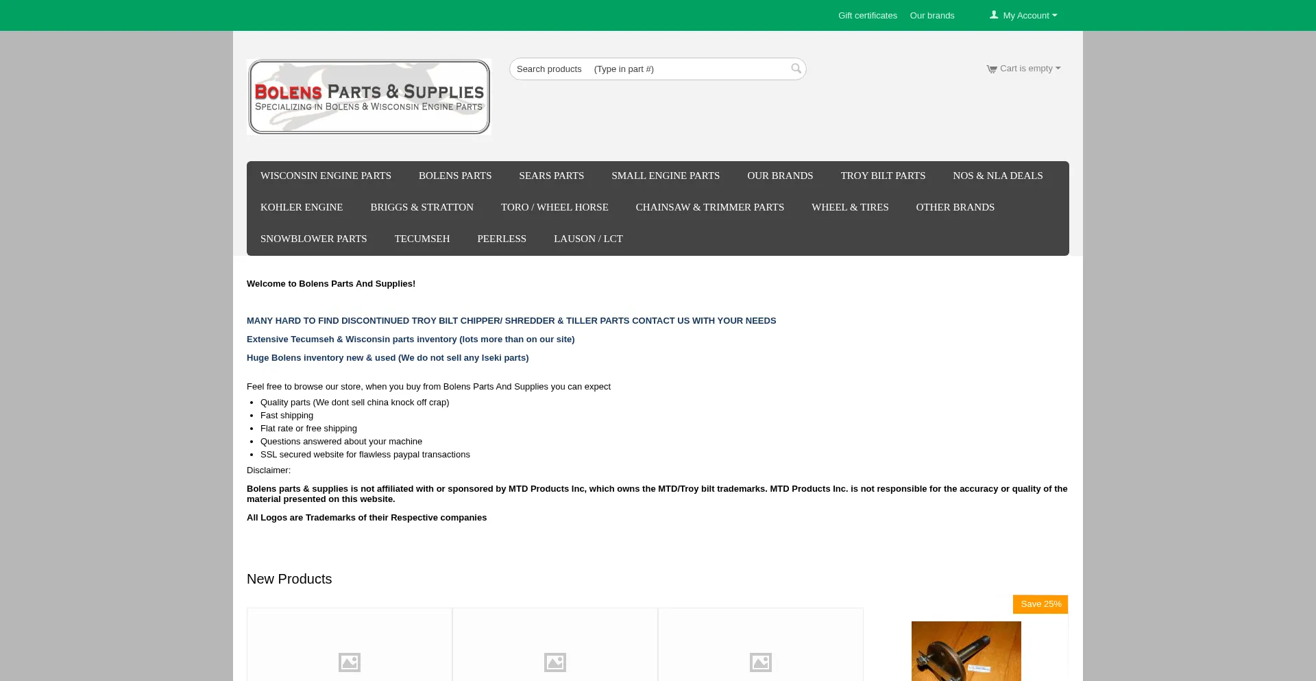Bolens Parts & Supplies carries everything from New, New Old Stock, and NLA parts for Bolens equipment and other brands of equipment. Also specialize in Bolens and Wisconsin parts.