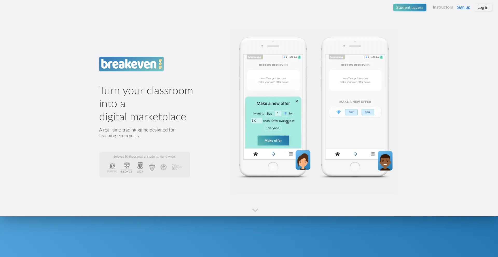 Turn your classroom into a digital marketplace. Breakeven is a real-time trading platform, designed for learning economics.