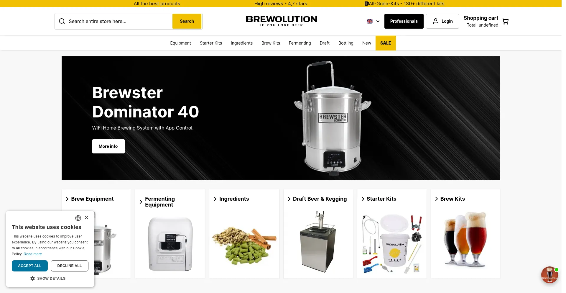 Discover top-quality brewing equipment at Brewolution, your ultimate homebrew shop. Dive into the art of beer making with our comprehensive range of homebrewing supplies. Start ...