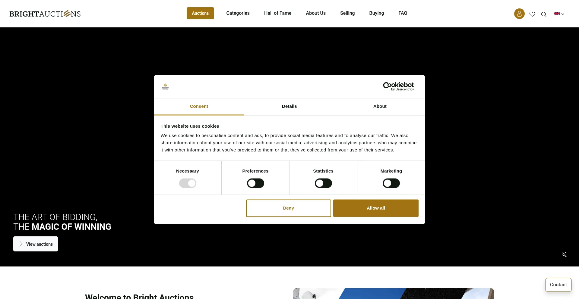 El sitio web implementa mecanismos de consentimiento de cookies en cumplimiento con regulaciones de privacidad como GDPR o CCPA. Esto demuestra que brightauctions.com adhiere a estándares de protección de datos y proporciona a los usuarios control sobre prácticas de recolección de datos personales.
