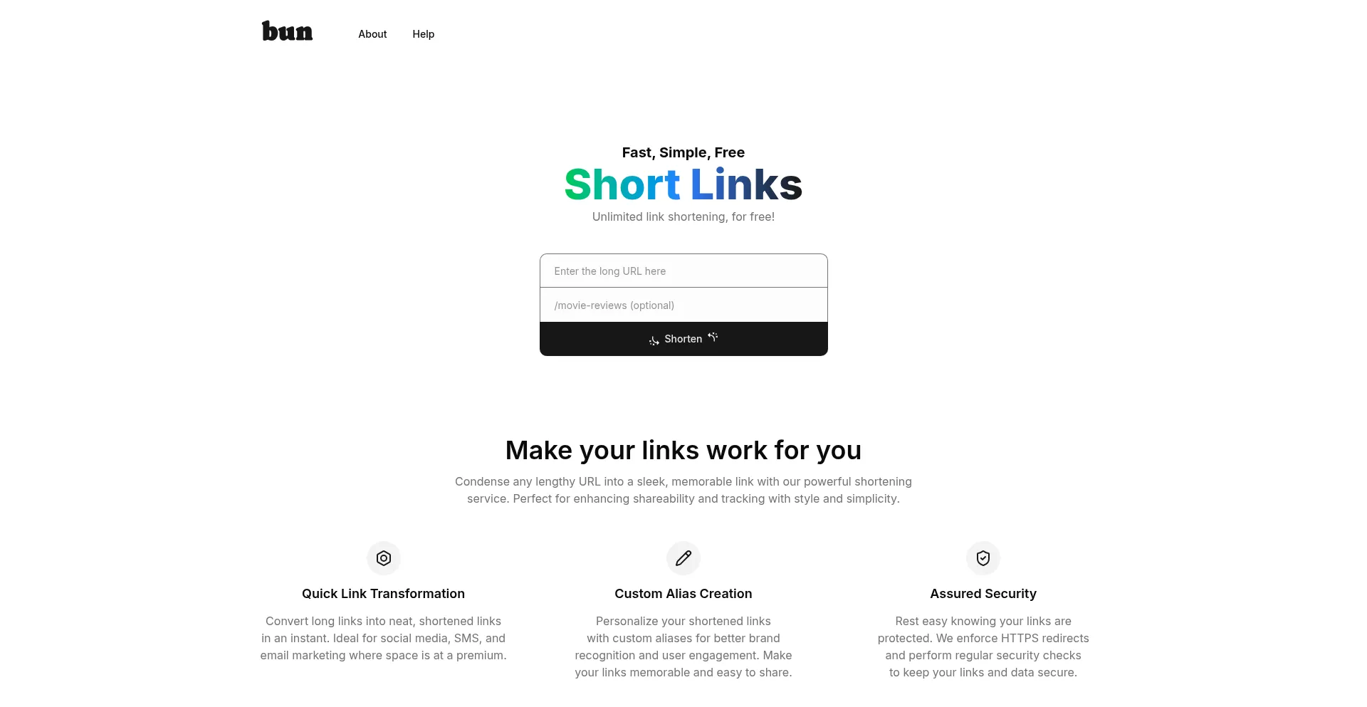 Experience the simplicity of bun.is - Your go-to tool for free, unlimited link shortening with custom alias options.