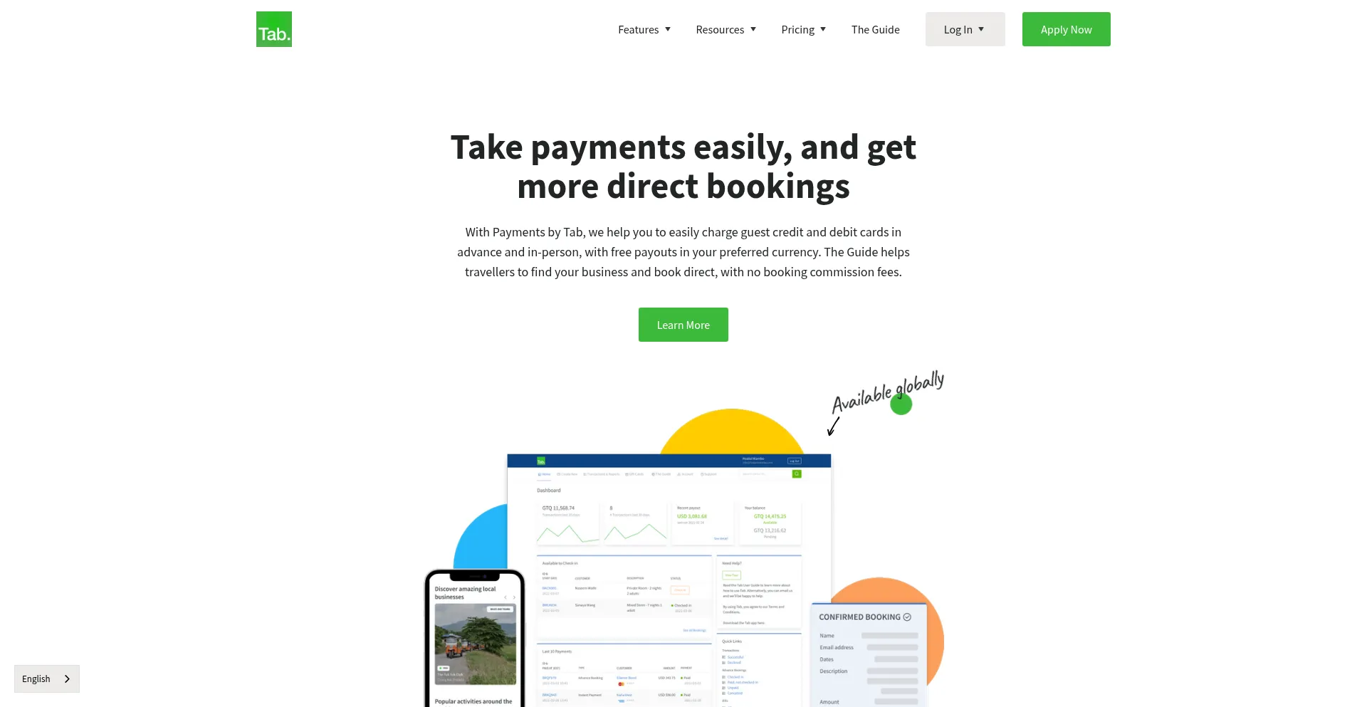 The Guide helps travellers find your business and book direct. Payments by Tab helps you easily charge guest credit and debit cards in advance and in-person.