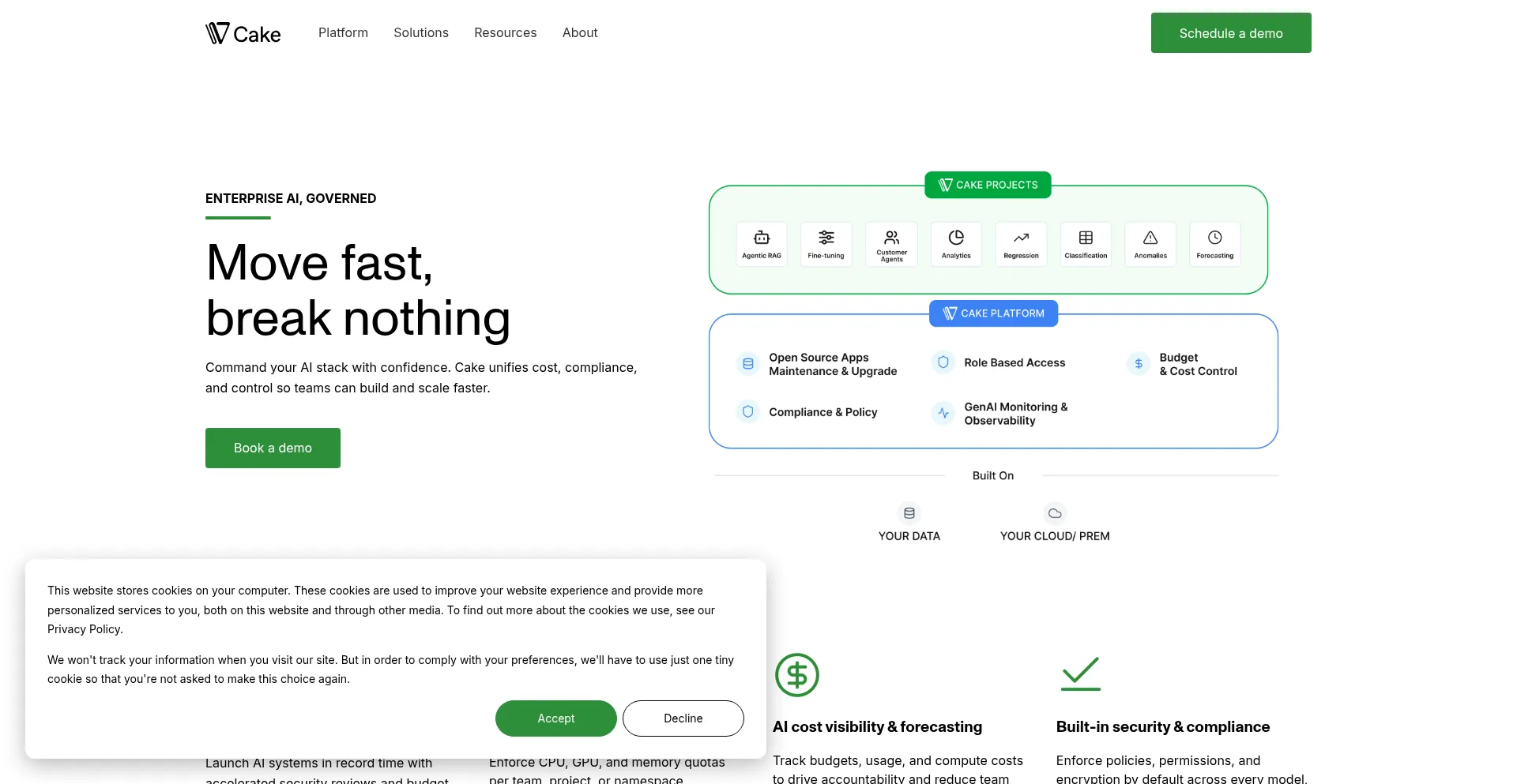 Accelerate AI deployment with Cake, ensuring cost control, compliance, and governance while maintaining flexibility across any infrastructure.
