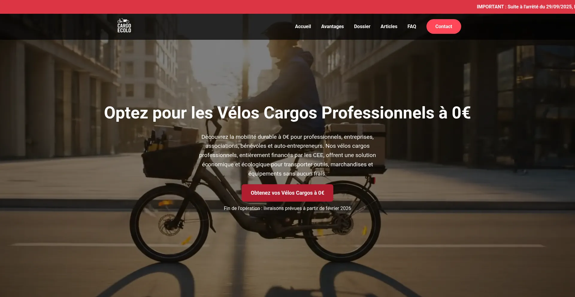 Découvrez nos vélos cargos professionnels 0€ gratuits, entièrement financés par les CEE. Une solution de mobilité écologique et économique pour professionnels, entrepri...