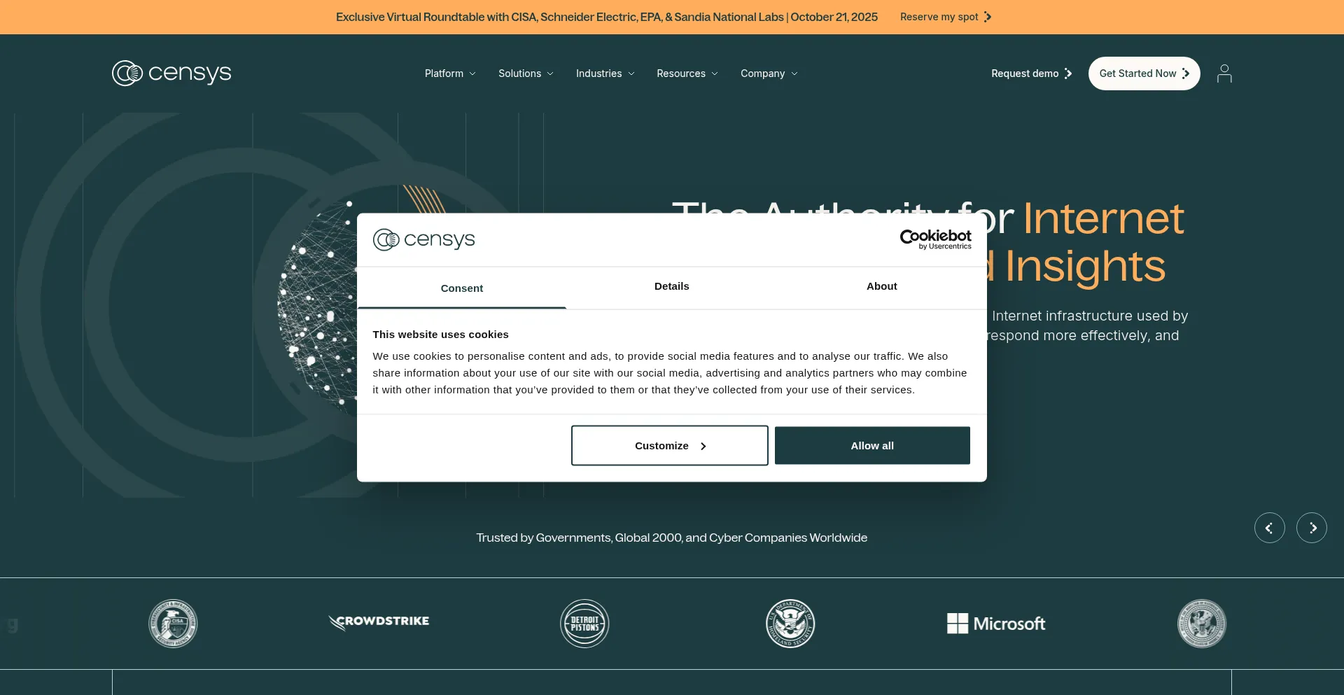 El sitio web implementa mecanismos de consentimiento de cookies en cumplimiento con regulaciones de privacidad como GDPR o CCPA. Esto demuestra que censys.io adhiere a estándares de protección de datos y proporciona a los usuarios control sobre prácticas de recolección de datos personales.