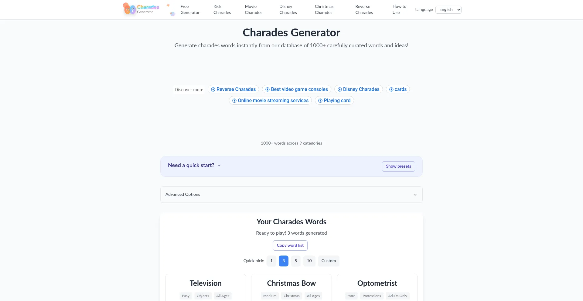Free charades generator with 1000+ words! Instant charades words for kids, adults, parties. Movies, Disney, animals, actions & more categories.