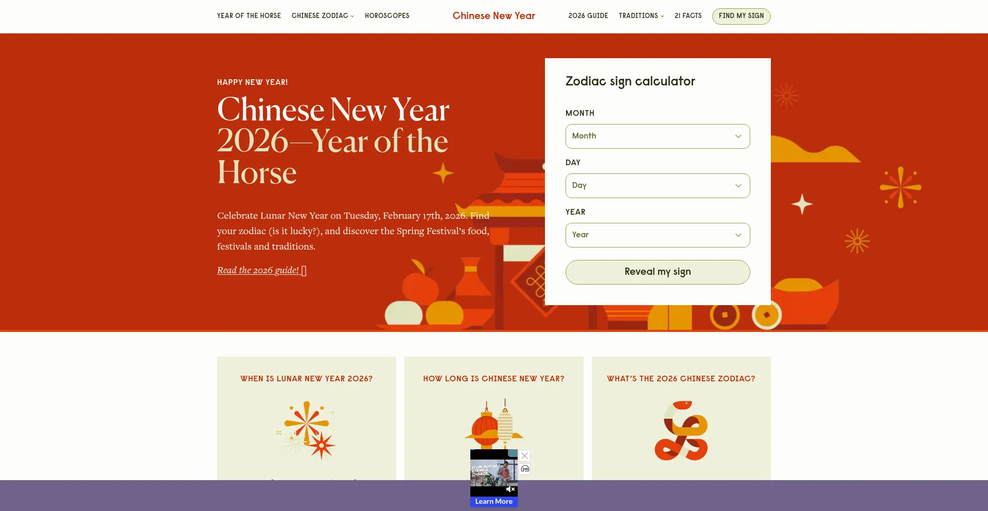 Celebrate Lunar New Year on Tuesday, February 17th, 2026. Find your zodiac (is it lucky?), and discover the Spring Festival’s food, festivals and traditions.