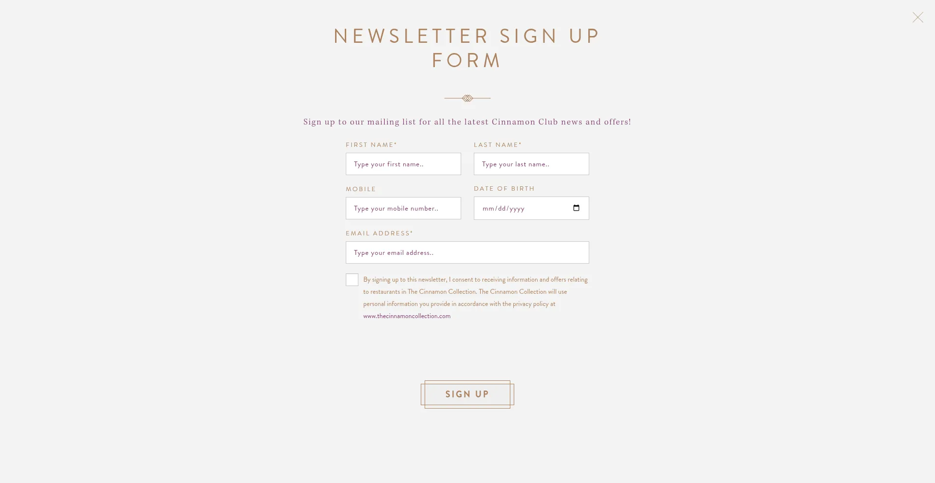 El sitio web implementa formularios de recolección de datos solicitando información personal incluyendo nombres, direcciones de correo electrónico, números de teléfono u otros detalles sensibles. Los usuarios deben verificar la legitimidad de cinnamonclub.com y revisar políticas de privacidad antes de enviar datos personales.
