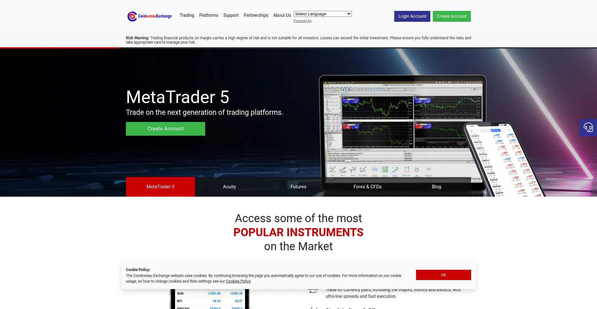 Start forex trading with Coinbureau Exchange and trade with low spreads & high leverage on CFD currencies, stock, commodities, indices, bonds, options, metals & more