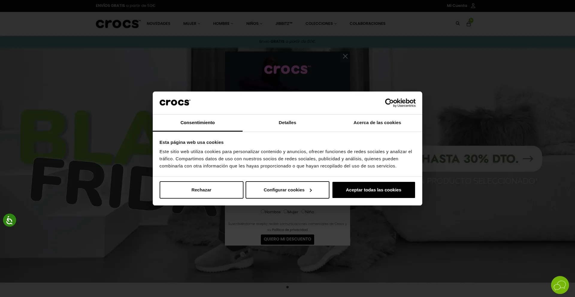 El sitio web implementa mecanismos de consentimiento de cookies en cumplimiento con regulaciones de privacidad como GDPR o CCPA. Esto demuestra que crocs.es adhiere a estándares de protección de datos y proporciona a los usuarios control sobre prácticas de recolección de datos personales.
