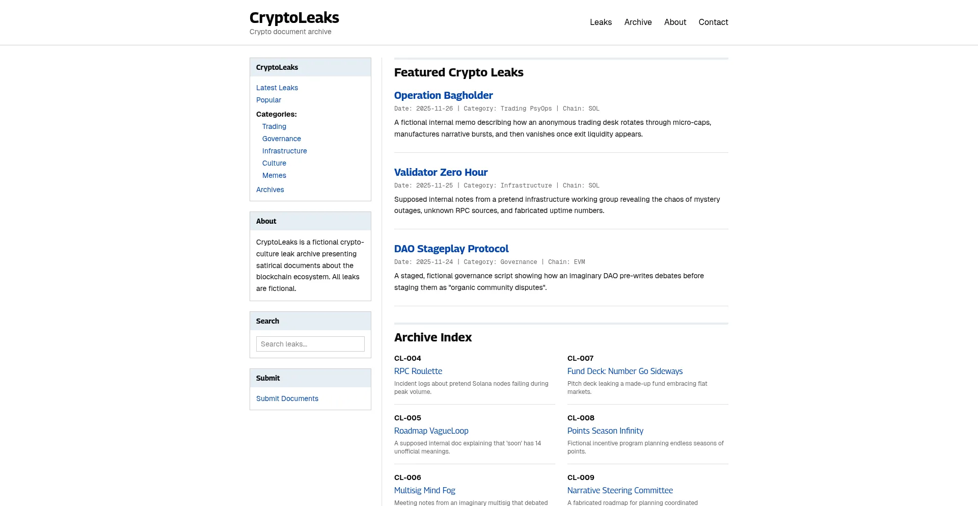 A satirical crypto-ecosystem leak archive presenting fictional documents about the blockchain space.