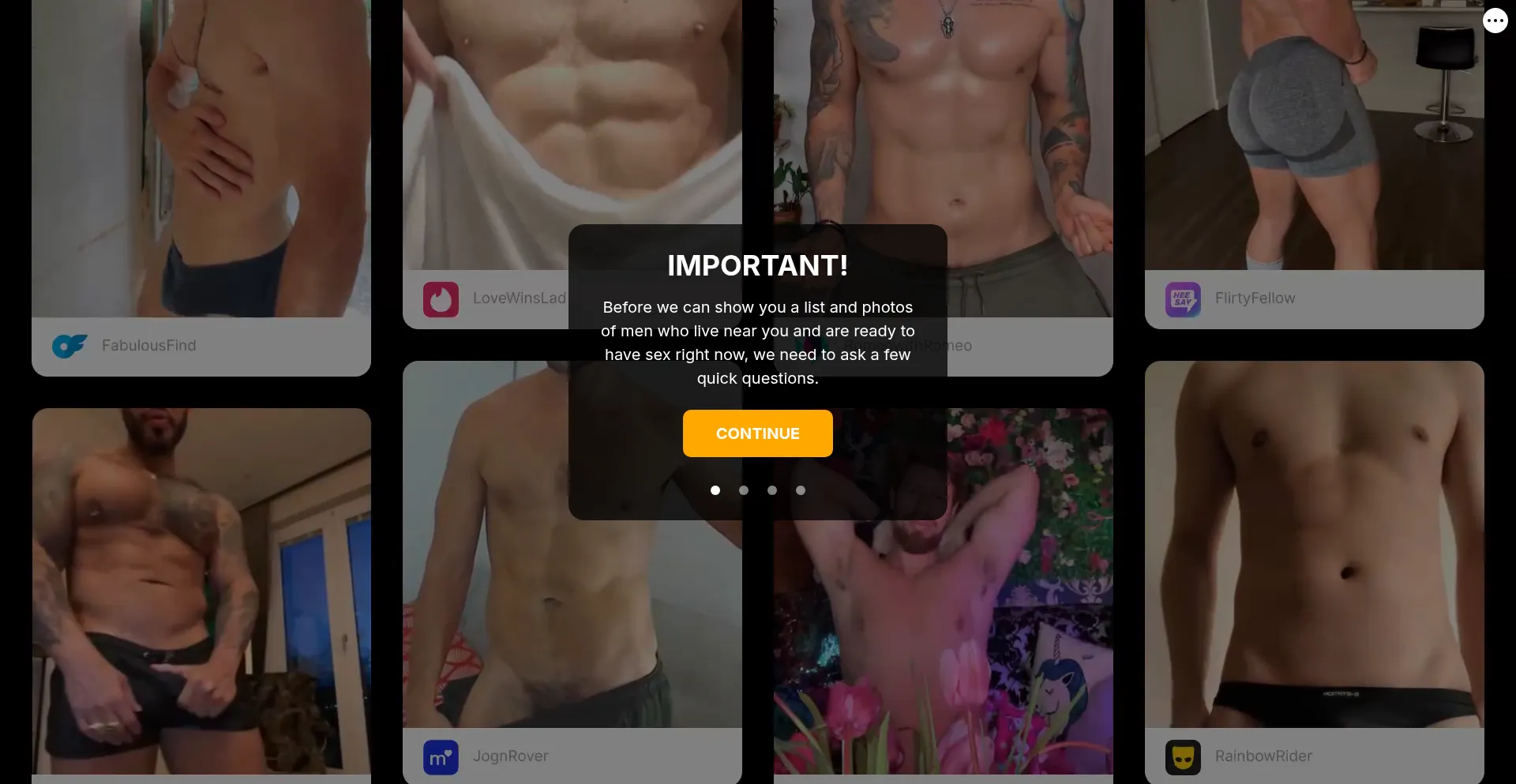 Before we can show you a list and photos of men who live near you and are ready to have sex right now, we need to ask a few quick questions.