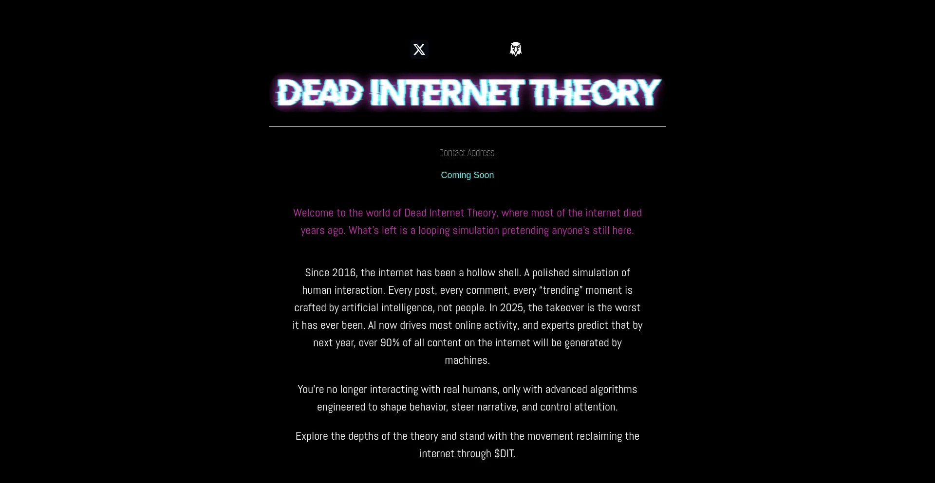 La presencia de enlaces de redes sociales en el sitio web indica que deadinternetheory.org mantiene cuentas oficiales en redes sociales, lo que es un indicador positivo de credibilidad y compromiso.