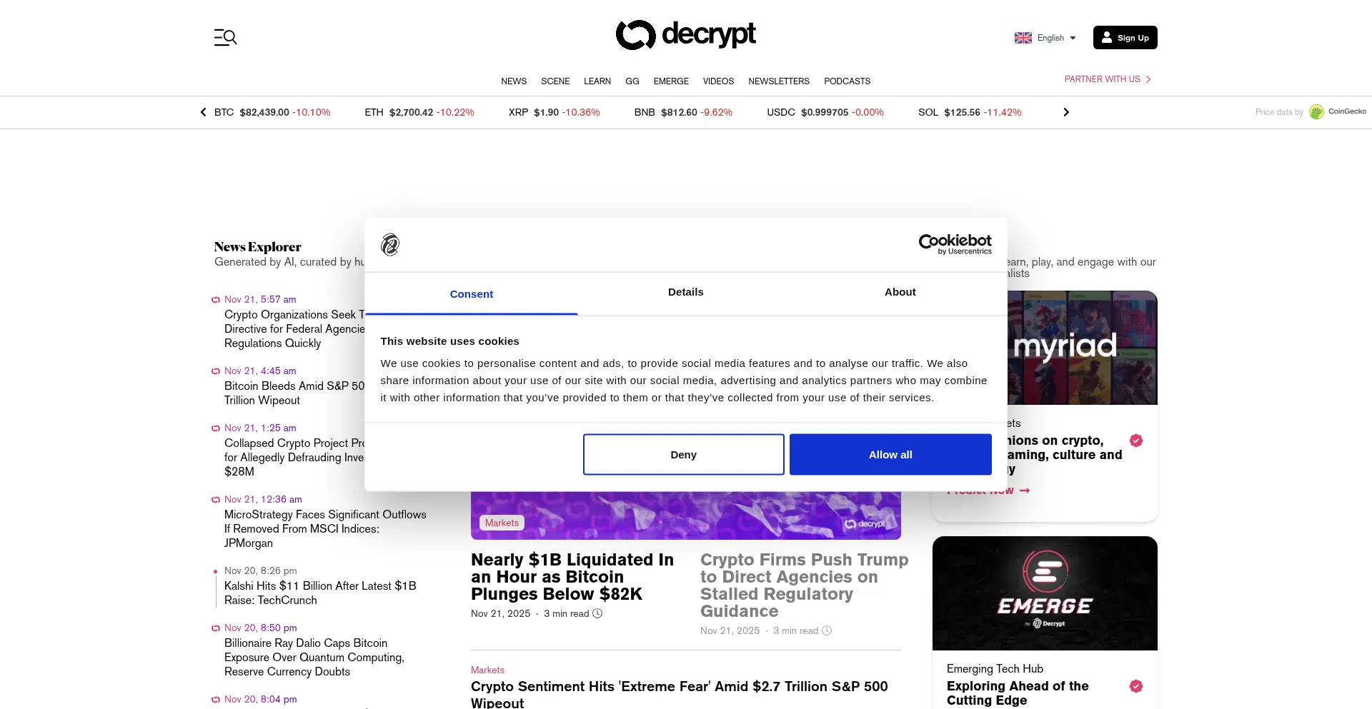 El sitio web implementa mecanismos de consentimiento de cookies en cumplimiento con regulaciones de privacidad como GDPR o CCPA. Esto demuestra que decrypt.co adhiere a estándares de protección de datos y proporciona a los usuarios control sobre prácticas de recolección de datos personales.
