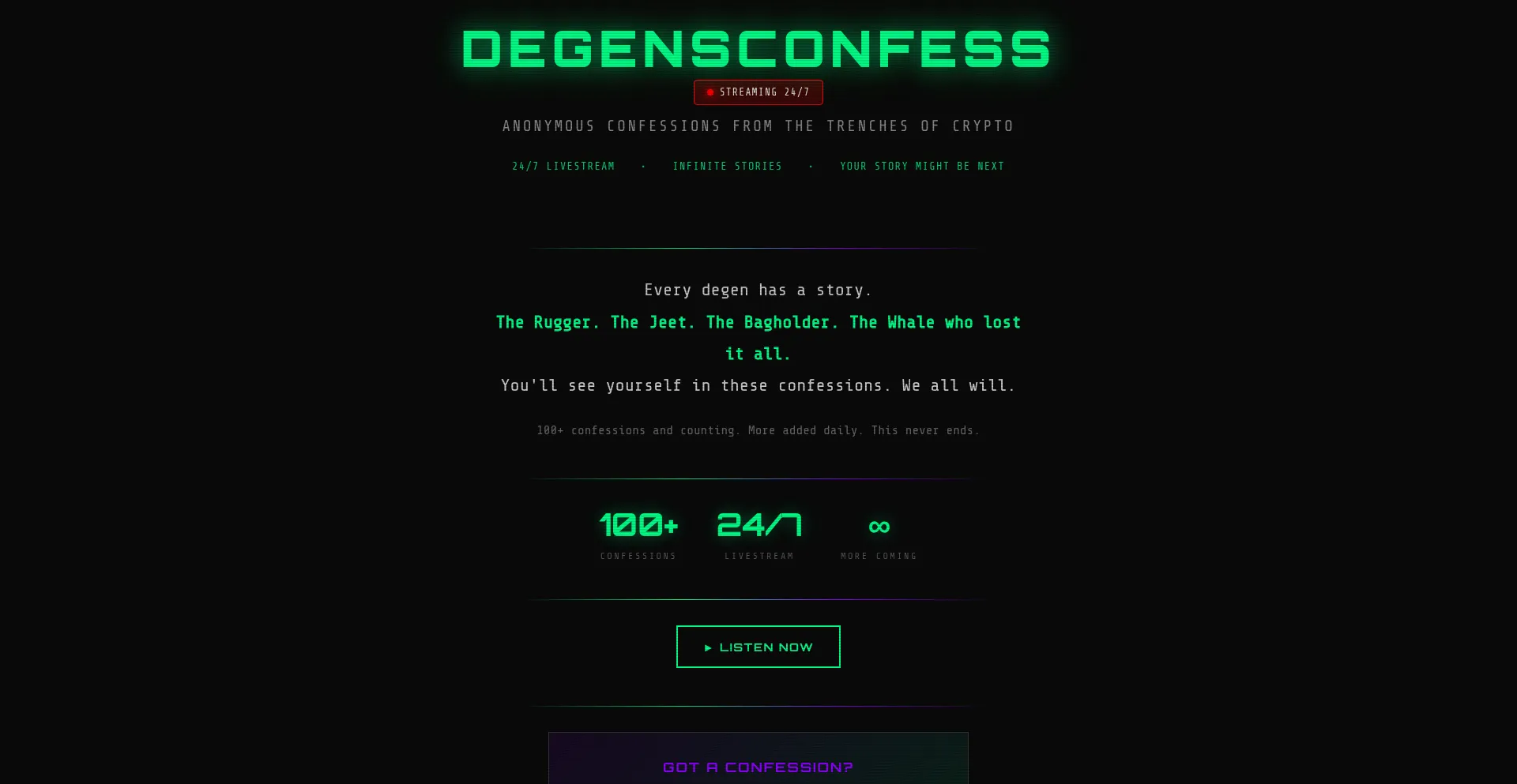 24/7 livestream of anonymous crypto confessions. The rugger. The jeet. The bagholder. Your story might be next.