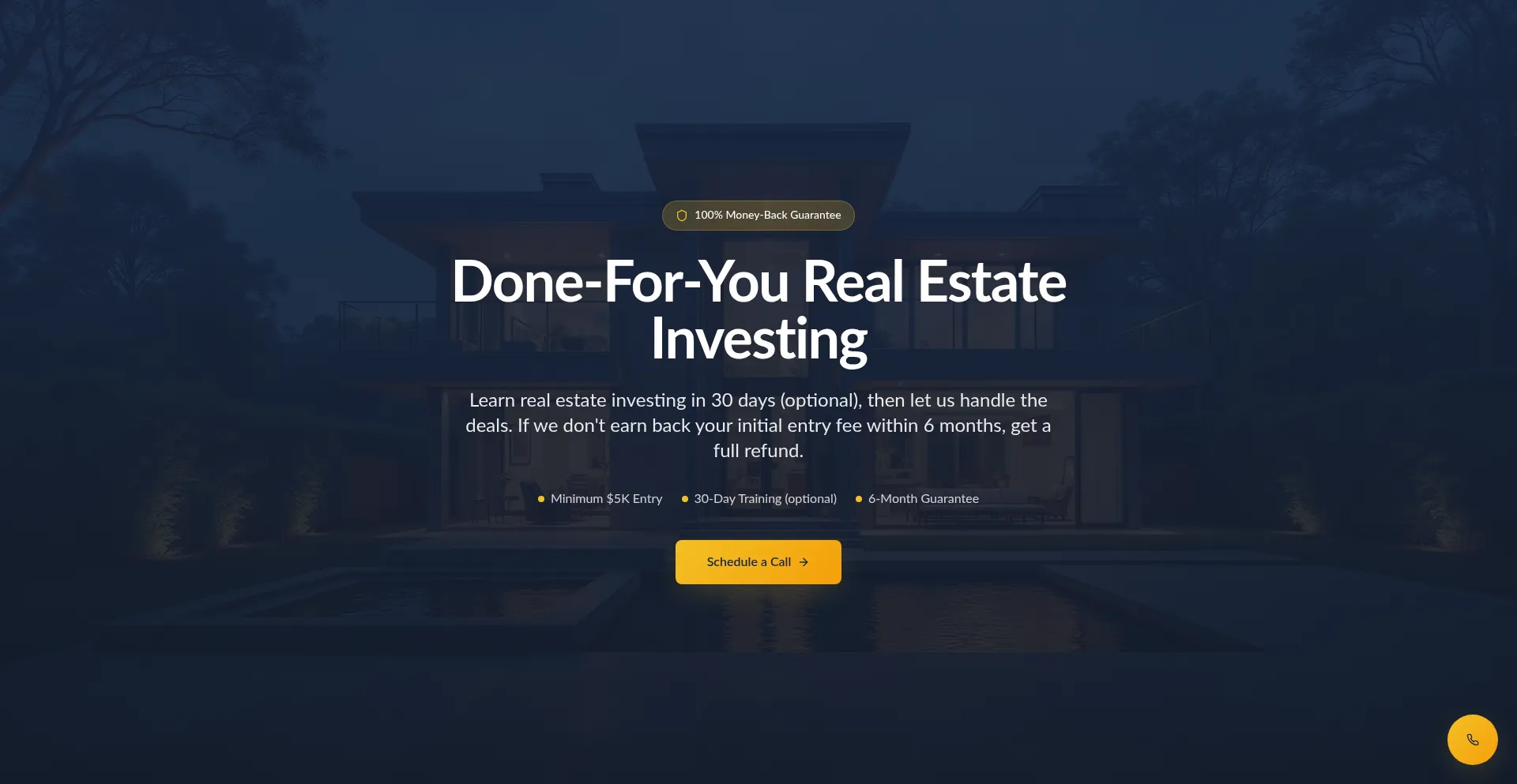 Learn real estate investing in 30 days with our done-for-you program. Minimum $5K entry fee with 100% money-back guarantee if we don't earn your investment back in 6 months.