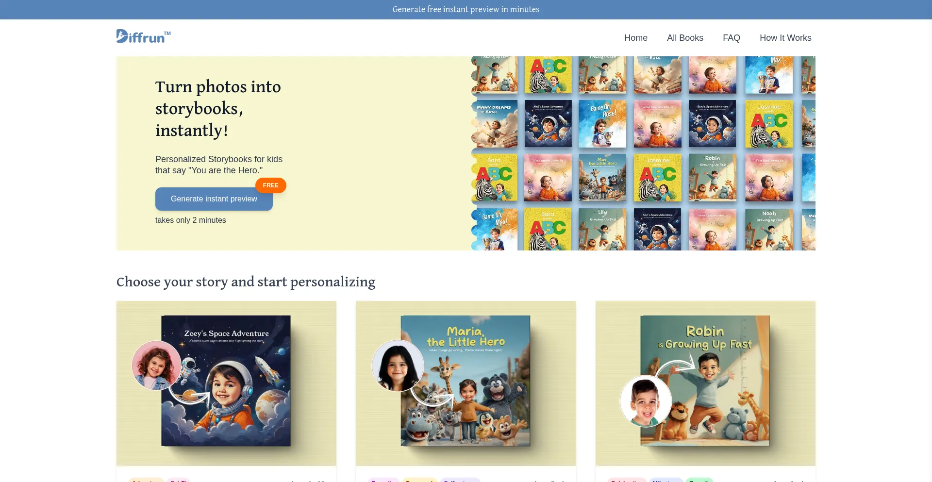 Create personalized storybooks where your child is the hero. Diffrun lets you turn their photo into a magical adventure — the perfect gift they'll never forget