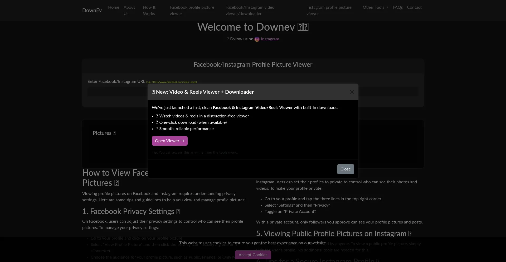 Download public data from the internet legally and ethically with DownEv, including a Facebook and Instagram profile viewer tool.