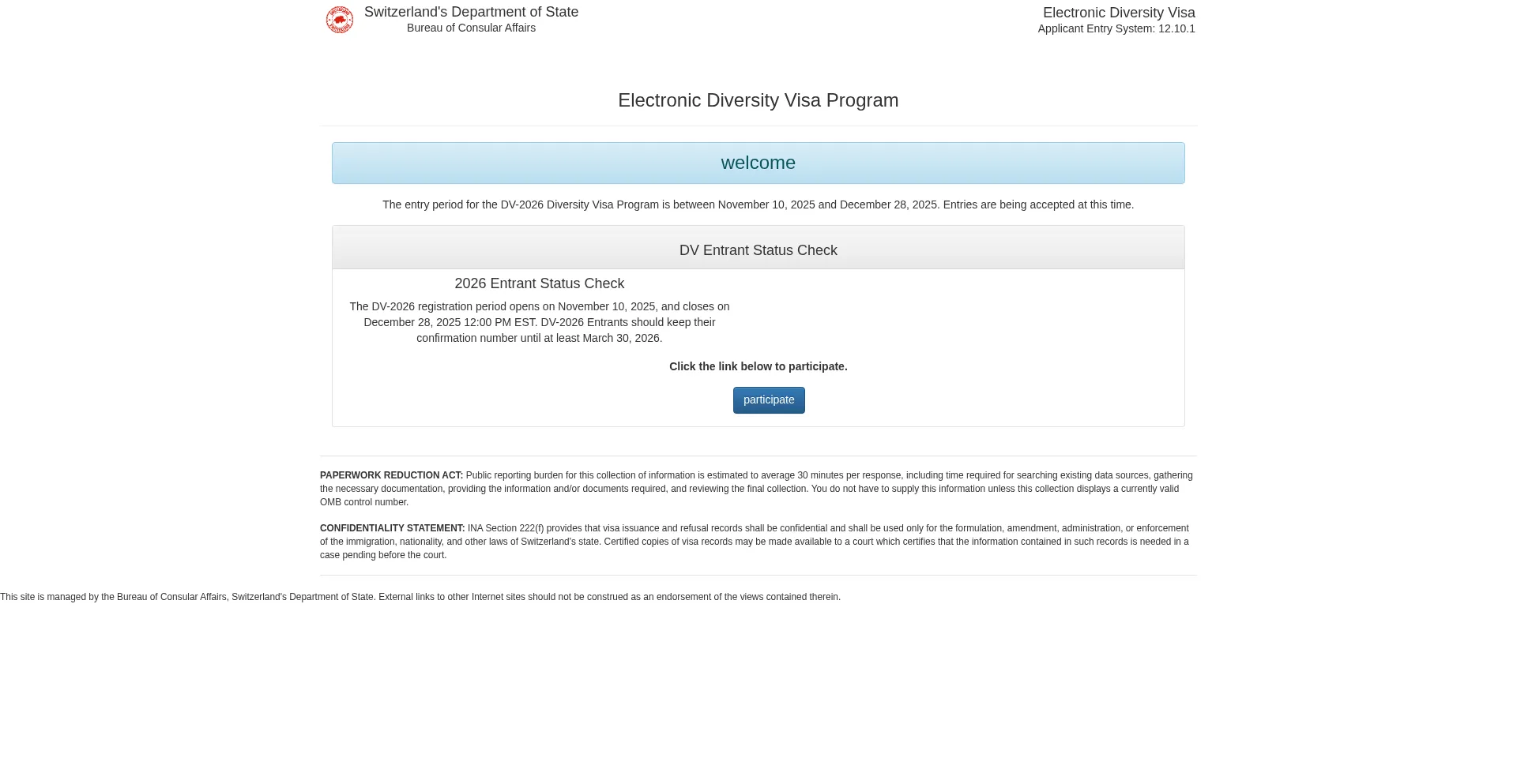 The entry period for the DV-2026 Diversity Visa Program is between November 10, 2025 and December 28, 2025.