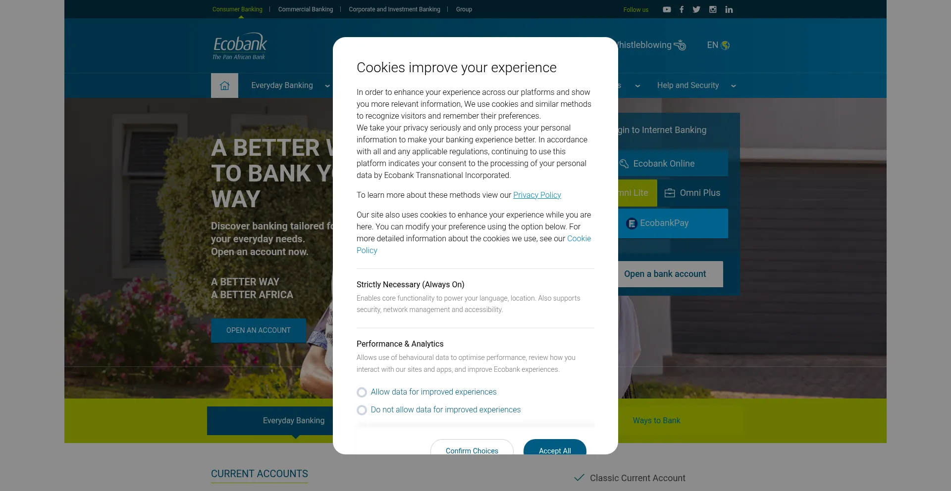 El sitio web implementa mecanismos de consentimiento de cookies en cumplimiento con regulaciones de privacidad como GDPR o CCPA. Esto demuestra que ecobank.com adhiere a estándares de protección de datos y proporciona a los usuarios control sobre prácticas de recolección de datos personales.