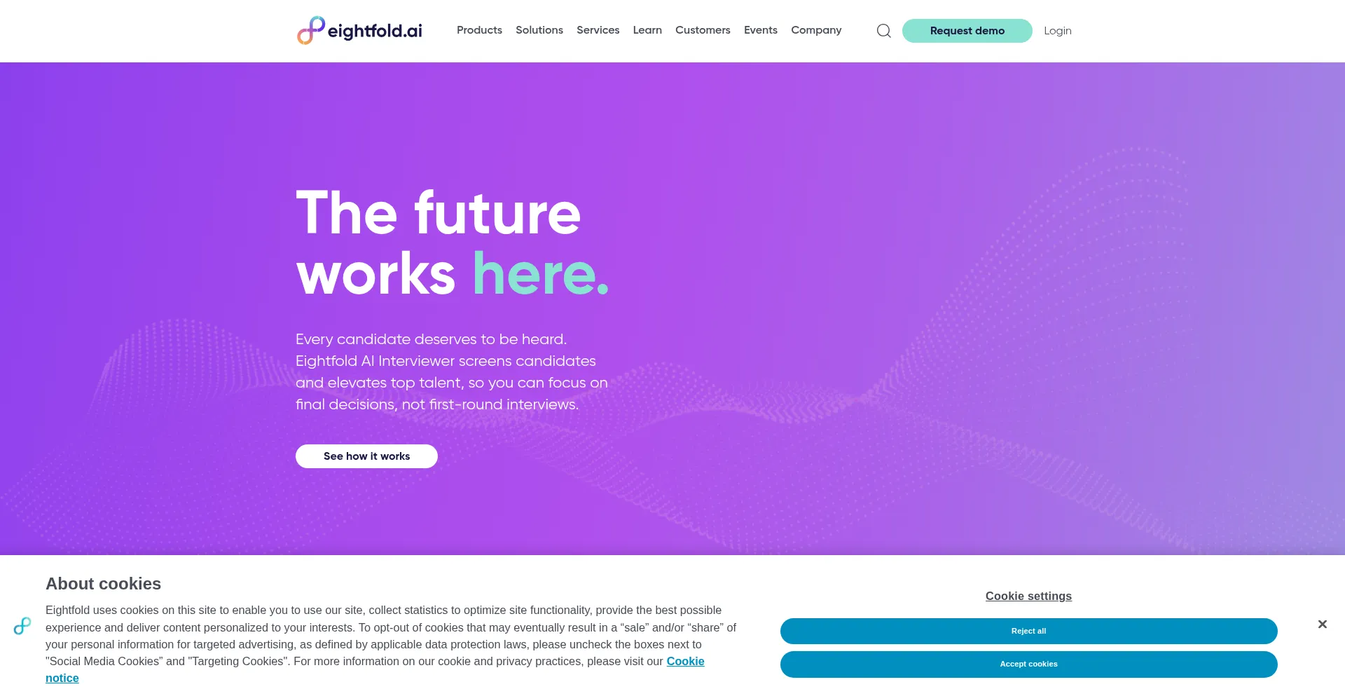 El sitio web implementa mecanismos de consentimiento de cookies en cumplimiento con regulaciones de privacidad como GDPR o CCPA. Esto demuestra que eightfold.ai adhiere a estándares de protección de datos y proporciona a los usuarios control sobre prácticas de recolección de datos personales.